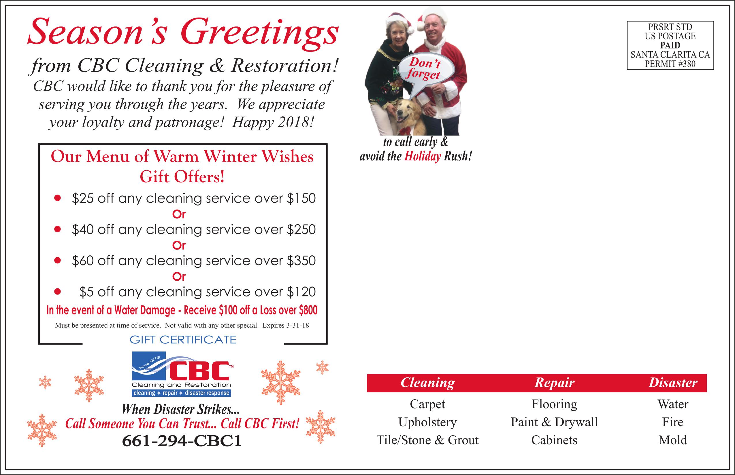 Our Warm Winter Wishes 2017! Happy Holidays from the whole team at CBC Cleaning & Restoration! « Previous PostNext Post » By: wddevelopers | September 7, 2022 in Blog